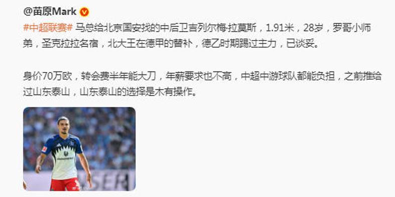 莫斯与汉堡的合同将于本赛季结束后到期,转会费将为10万欧元。目前德转身价为70万欧元。该媒体称,国安已要求拉莫斯周二在汉堡完成了体检。德甲保级队替补,踢中超够用了!有球迷调侃:“转会费便宜,不会有大坑吧!”“这可是方昊留下的转会费啊。”“方昊换个中卫外援,合适。”