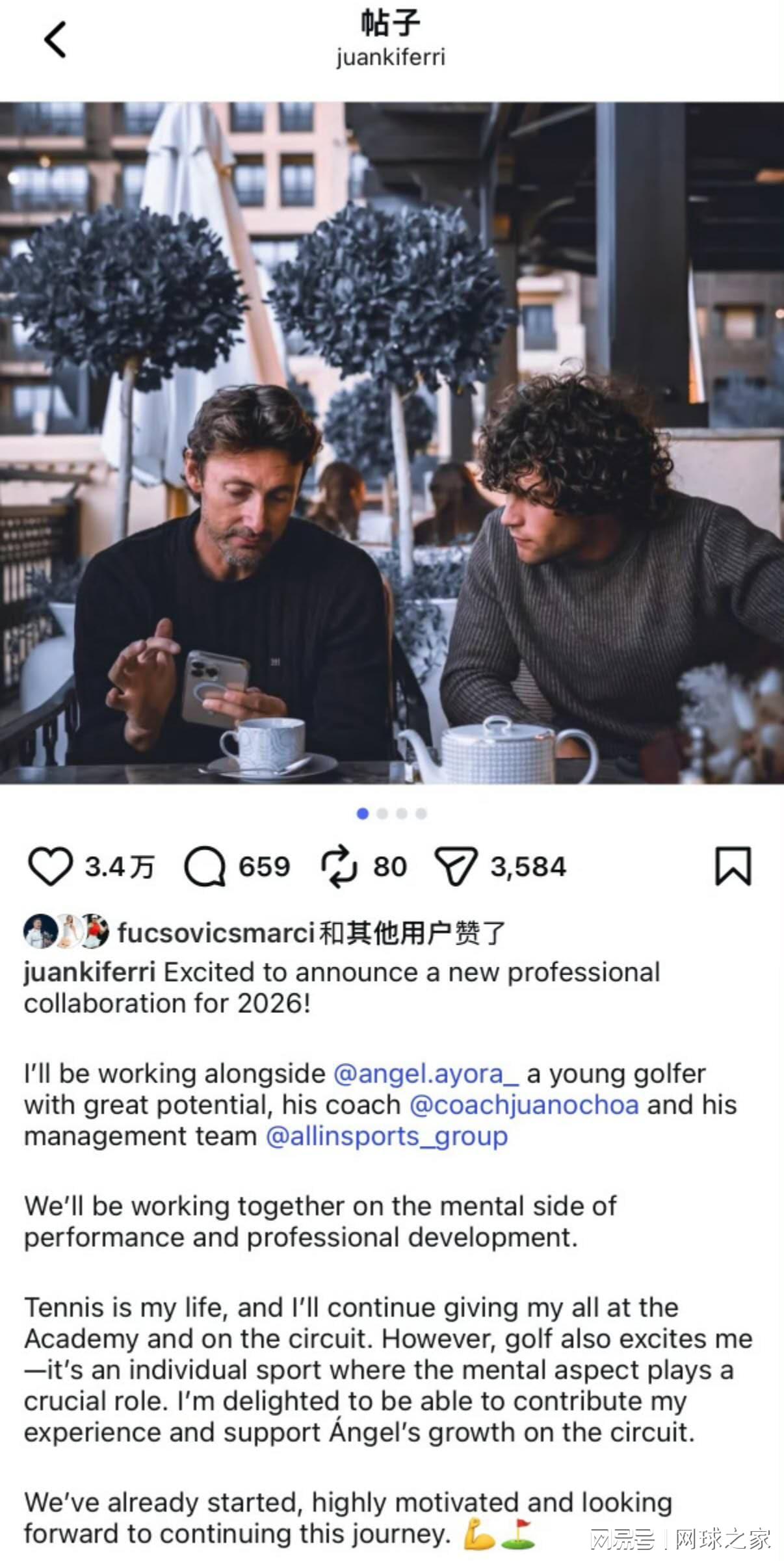 费雷罗在社交媒体上对于这样一次独特的跨界合作写道,“激动地宣布我将在2026年开启一项全新职业合作!我将与潜力无限的年轻高尔夫球手阿约拉、他的教练及其管理团队携手共进。我们将共同致力于其比赛心理素质与职业发展的提升。网球是我的生命,我仍将在学院和巡回赛中全力以赴。但高尔夫同样让我振奋——这是一项心理因素至关重要的个人运动。我很高兴能贡献自己的经验,支持他在巡回赛中的成长。我们已经启程,满怀动力,期待延续这段旅程。”